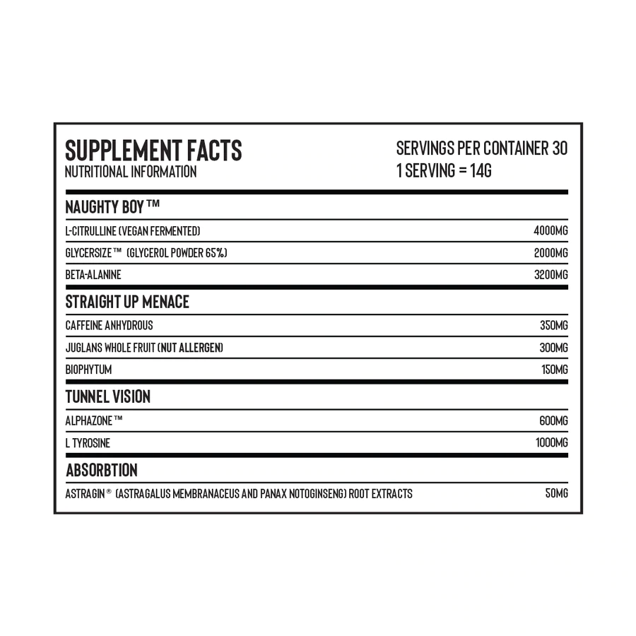 Naughty Boy Menace inneholder 350 mg koffein per full scoop . Ikke konsumere mer enn 1/2 scoop innen en  24 timers periode.