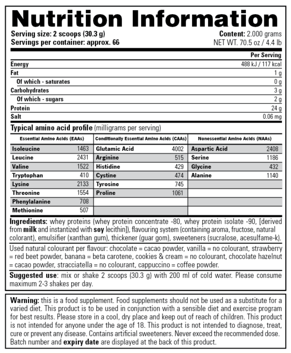 100% Whey is the showcase product of Stacker2 Europe’s sports nutrition line. 24 grams of protein in 30 grams of powder create a protein percentage of almost 80%, and this protein percentage is entirely made up of whey. 100% Whey is the best protein with the highest biological value. Both professional athletes and regular users are full of praise for our 100% Whey product quality. Finally, there’s a protein shake on the market that dissolves completely, tastes great when mixed with water and contains no added sugar nor aspartame.