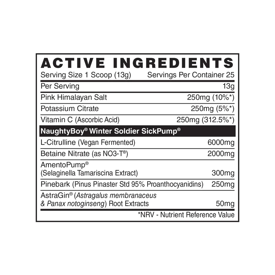 Winter Soldier SickPump® ble formulert for å lage “Sick Pumps” ved å bruke forskjellige veier for å maksimere nitrogenoksidproduksjonen. Winter Soldier SickPump® er drevet av NO3-T®, AmentoPump® og AstraGin®.
